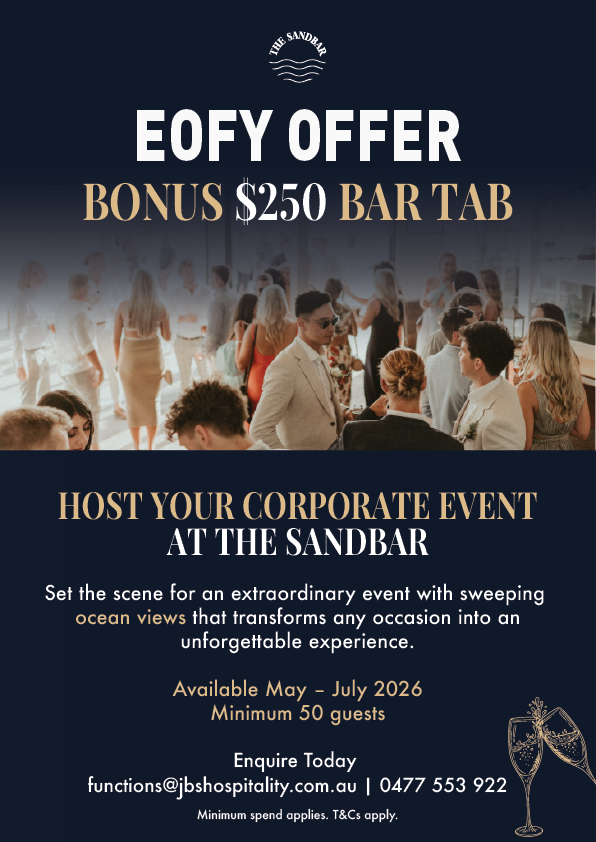 Celebrate the end of financial year at The Sandbar, one of Melbourne’s most sought-after beachfront function venues. With sweeping ocean views and a relaxed coastal atmosphere, it’s the perfect setting to reward your team, entertain clients or host an unforgettable corporate event.